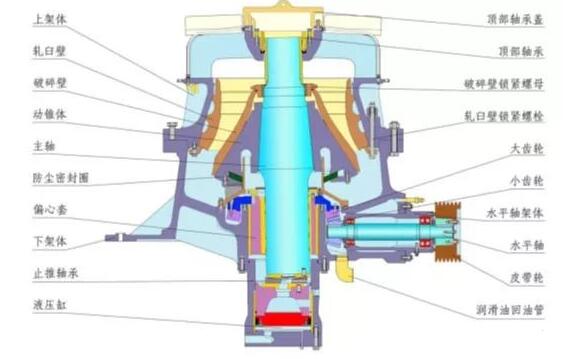 單缸液壓圓錐破與彈簧圓錐破類似,主軸與動(dòng)錐體組合在一起,同時(shí)由碗形瓦承載,因此,主軸和動(dòng)錐體相當(dāng)于底座支撐起來(lái),偏心套帶動(dòng)主軸提供破碎力。