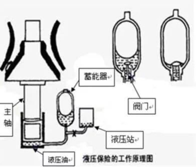 過(guò)鐵時(shí),液壓油注入蓄能器,主軸下墜;過(guò)鐵后,蓄能器將油壓回,破碎機(jī)正常運(yùn)行。清腔時(shí)也是用液壓泵。